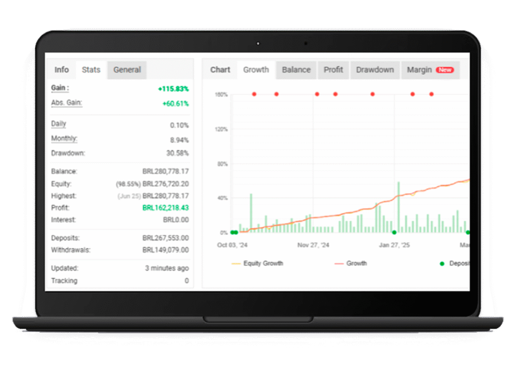 Sim. Todas as estratégias utilizadas pelo algoritmo passaram por backtests extensos desde outubro de 2024. Foram validadas em contas reais de mercado, com foco em consistência, controle de risco e performance sólida. Não tem achismo aqui — é tudo testado antes de rodar com o seu dinheiro.